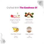 Aqua, Oryza Sativa (Rice) Bran Oil, Light Liquid Paraffin, Glyceryl Stearate, PEG-100 Stearate, Isopropyl Myristate, Glycerin, Ethylhexyl Methoxycinnamate, Niacinamide, Cetyl Alcohol, Propylene Glycol, Dimethicone, Phenoxyethanol, Triethylene Glycol, Perfume, Xanthan Gum, Di stearate, Polyoxyethylene-20 Cetostearyl Alcohol, Sodium PCA, Titanium Dioxide, Shea Butter, Methylene Bis-Benzotriazolyl Tetramethylbutylphenol, Triethanolamine, Pectin, Acrylates/C10-30 Alkyl Acrylate Crosspolymer, Pentaerythrityl Tetra-di-t-butyl Hydroxyhydrocinnamate, Tocopheryl Acetate, Herbal Extract DDS, Disodium EDTA, Pearl extract, Organic Rose Oil.