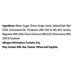 Water, Onion, Ginger, Sugar, Garlic, Iodized Salt, Sunflower Oil, Red Chilli, Celery, Acidity Regulator, Starch, Preservative, Stabilizer & Soyabean