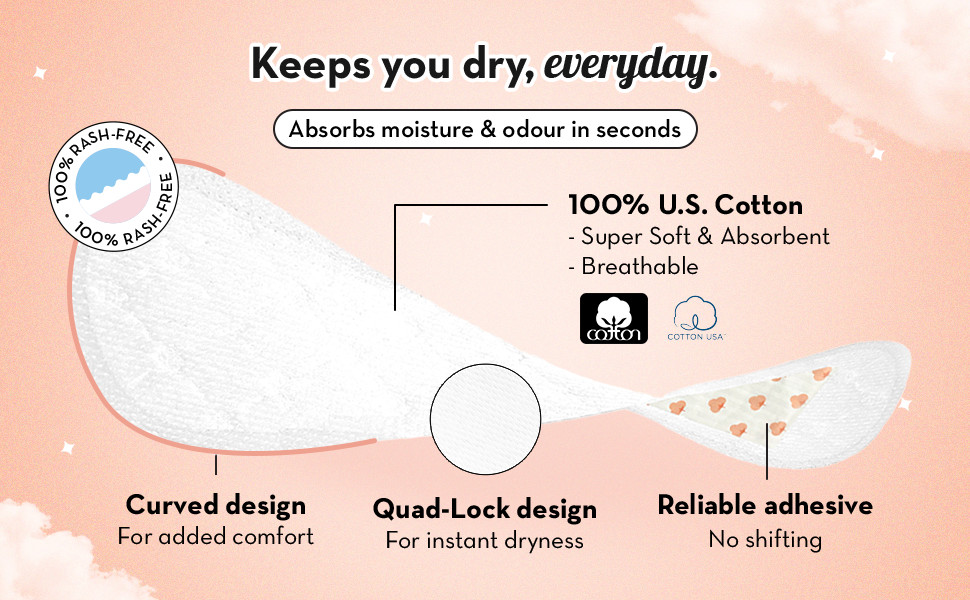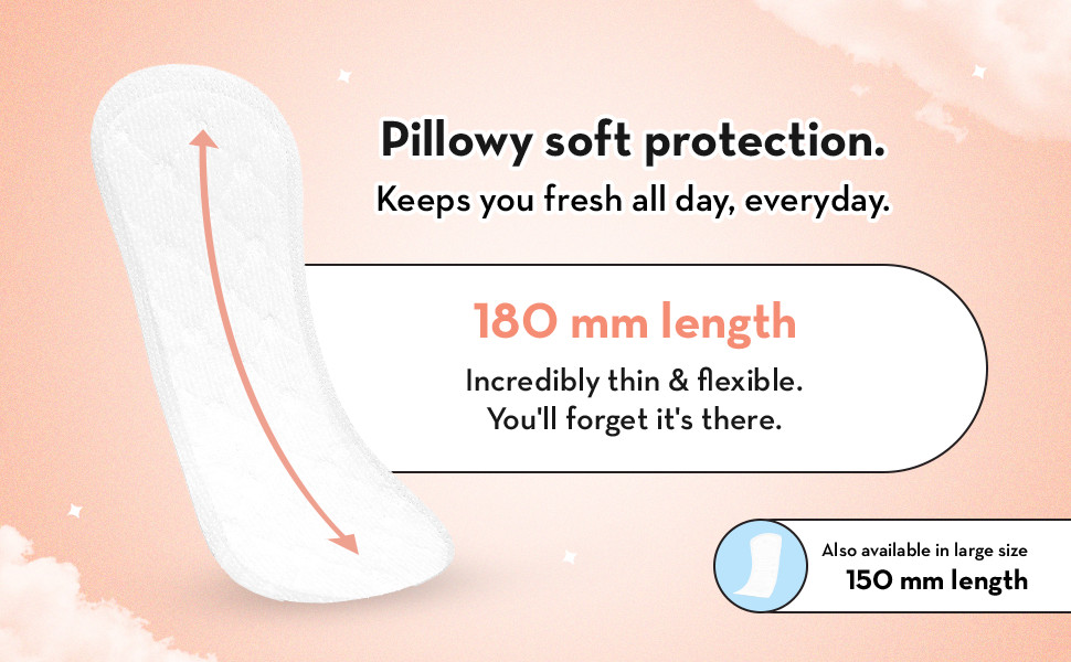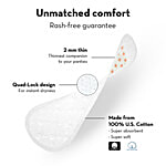 So light you won't feel like you are wearing one. Plush Large Panty Liners are Easy, Breezy & Comfortable. With a wider coverage of 180 mm in length, they ensure you keep going all day. Our quad-lock design structure adjusts to any underwear and provides all-day comfort. All our liners are crafted with Pure U.S. Cotton adhering to the highest standards. Free of fragrance, paraben and chlorine, we always wish to provide natural ingredients which provide real performance.