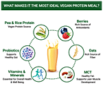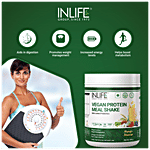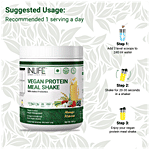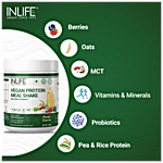 INLIFE Vegan Plant Based Meal Replacement Shake includes 17.5 grams of plant-based clean protein (Pea & Rice), 2.3 grams of dietary fibre, 26 vitamins & minerals, 262 calories per serving. Medium Chain Triglycerides MCT supports lean muscle, provides healthy fat and boosts energy. Our amino acid-infused plant-based protein blend promotes a complete healthy balance. INLIFE Vegan Meal Replacement Shake is a completely vegan and vegetarian-friendly, meal on the go for those with little or no time for breakfast, lunch, or dinner. A perfect way to supplement your daily diet and nutrition needs. This product includes berries that are a rich source of Antioxidants, Oats a rich source of fibre and comes with added probiotics to support your gut health. A perfect blend of Pea Protein Concentrate, Rice Protein Concentrate and Oats powder has an exceptionally good PDCAA score. It provides Protein, Carbohydrates & Fat in a balanced ratio of 2:3:1.