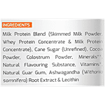 Milk Protein Blend (Skimmed Milk Powder, Whey Protein Concentrate & Milk Protein Concentrate). Cane Sugar (Unrefined). Cocoa Powder. Colostrum Powder, Minerals **. Natural Flavouring Substance, Vitamins*, Natural Guar Gum. Ashwagandha (Withania somnifera) Root Extract & Lecithin