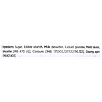 Sugar, Edible starch, Milk Powder, Liquid Glucose, Maltodextrin, Emulsifier [470 (i)], Colours[INS 171, INS102, INS 127, INS133, INS110, INS122], Glazing Agent [INS 901, INS 903].