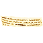 Dried Red Chilli(36%), Garlic(15%), Lemon Grass(14%), Shallots(13%), Iodised Salt(12.5%), Galangal(6%), Shrimp Paste(1.50%), Crustacean, Kaffir Lime(1%), Spices 1%.