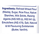 Refined Wheat Flour (Maida), Sugar, Rice Flour, Native starches, Milk Solids, Raising Agents (INS 500 (iI), INS 541 (i)), Emulsifiers (INS 475), Salt, Natural & NI Flavouring substances (Butter, Vanilla). Contains Wheat, Milk Ingredients. May contain traces of nuts.