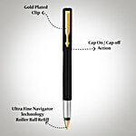 Parker Vector Matte Black Gold Trim Fountain Pen Fine With Gold Nib comes with a snug grip and has a smooth fine tip which makes it easy to write. You can now write without the threat of blotched ink. It has a modern and colourful, slim and sturdy designed body. The ink flows flawlessly and is in control for neat and smudges-free writing. It gives an easy, secure and dependable writing experience.