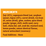 Suji (42%), Supergrain Blend (Oats, Sorghum (Jowar), Bajra (34%), Carrots (Dried), Rice Bran Oil, Onion (Dried), Ghee, Cashews, Spice Blend Powder (Ginger, Chilli, Methi Seed, Curry Leaf), Chana Dal, Salt, Urad Dal, Mustard Seed, Lemon Powder, Nature Identical Flavour, Natural Anti-oxidant (Rosemary)