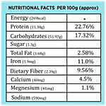 Nutrition per gram/ml: 100g Energy: 269kcal Protein: 11.38g Carbohydrates: 51.97g Sugar: 1.3g Total Fat: 1.68g Iron: 1.9mg Dietary Fiber: 2.39g Calcium: 40mg Magnesium: 40mg Sodium: 590mg