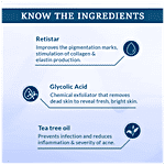 Packed with well-researched actives, this gel effectively treats acne skin conditions without imparting any ill effects on the skin. Glycolic acid and Salicylic acid help to exfoliate dead skin cells and unclogs pores & heal blemishes and prevent new ones from forming. Retistar, a stable form of retinol is used for its ability to promote cellular growth. It treats acne with the root causes and regulates the oil secretion. It reduces blemishes & acne marks. It helps to improve the pigmentation marks and stimulate of collagen and elastin production.