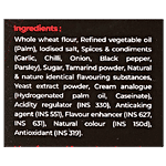 Whole Wheat Flour, Refined Vegetable Oil (Palm), Iodised Salt, Spices & Condiments (Garlic, Chilli, Onion, Black Pepper, Parsley), Sugar, Tamarind Powder, Natural & Nature Identical Flavouring Substances, Yeast Extract Powder, Cream Analogue (Hydrogenated Palm Oil, Caseinate), Acidity Regulator (INS 330), Anticaking Agent, Flavour Enhancer, Natural Colour, Antioxidants