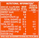 Nutrition per gram/ml: 100g Serving Size: 14.4 g Energy (kcal): 500 kcal Protein (g): 6.9 g Carbohydrate (g): 68 g Total Sugars (g): 23.1 g Added Sugars (g): 22.6 g Total Fat (g): 22.3 g Saturated Fat (g): 9.7 g Trans Fat (g): 0 g Cholesterol (mg): 0 mg Sodium (mg): 249 mg