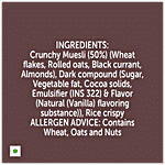 Crunchy Muesli, Wheat Flakes, Rolled Oats, Black Currant, Almonds, Dark Compound - Sugar, Vegetable Fat, Cocoa Solids, Emulsifier, Natural Vanilla Flavouring