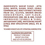 Wheat Flour Atta(53%),Water, Sugar, Yeast, Edible Common Salt, Malt Extract, Refined Palm Oil, Soyabean Oil, Gluten, Brown Bread Concentrate, Soy Flour, Preservatives [280, 281 & 200], Flour Improvers [1100(I) & 1104], Antioxidant [300], Anticaking Agent [170(I)] And Emulsifiers [481(0,471,472-8C 479].