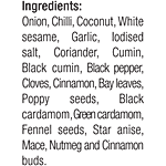 Onion, Chilli, Coconut, White Sesame, Garlic, Iodised Salt, Coriander, Cumin, Black Cumin, Black Pepper, Cloves, Cinnamon, Bay Leaves, Poppy Seeds, Black Cardamom, Green Cardamom, Fennel Seeds, Star Anise, Mace, Nutmeg, Cinnamon Buds.