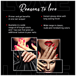 Get everyday perfect nails with primer and gel nail colour. The range has colours that give your nails an instant glossy shine with a long-lasting finish. Now coat your nails with vibrant colours that stay through your busy work days. Available in a wide range of 49 bright colours and 1 top coat that gives an additional lustre to your nails. A nail paint for everyday use, these shades are simply a must-have!