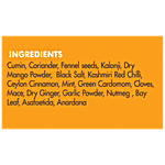 Cumin, Coriander, Fennel seeds, Kalonji, Dry Mango Powder, Black Salt, Kashmiri Red Chilli, Ceylon Cinnamon, Mint, Green Cardamom, Cloves, Mace, Dry Ginger, Garlic Powder, Nutmeg, Bay Leaf, Asafoetida, Anardana