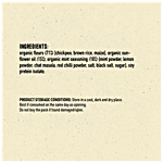 Organic Flours (71%) [Chickpea, Brown Rice, Maize], Organic Sunflower Oil (15%), Organic Mint Seasoning (10%) [Mint Powder, Lemon Powder, Chat Masala, Red Chilli Powder, Salt, Black Salt, Sugar], Soy Protein Isolate.