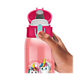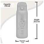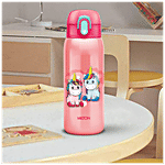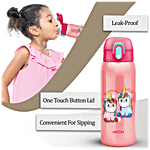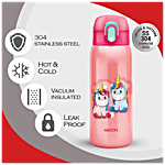 MILTON presents Jolly Stainless Steel Insulated Water Bottle. A wonderful addition to our back-to-school range! Presenting vacuum-insulated bottles with a one-touch button lid for your little one with attractive graphics that keeps liquids cold/hot for hours. This one comes with a straw for easy sipping and includes a dust-free cap for hygiene. The anti-skid bottom and belt make it easily portable.
