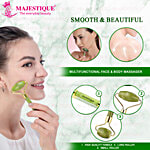 Majestique Facial Massager Jade Roller Tool is less likely to fall off metal parts, designed to deliver noiseless rolling without any squeaks. Our jade face roller has a delicate and smooth rolling surface, built on a sturdy integrated frame with a curved handle to ensure reliable use. Jade is known as a lucky stone as it magnifies energies of love wealth & health. Jade is connected to the heart chakra, promoting self-love and healing. Start with a clean face and prep your skin with a facial oil or serum. The face rollers help in increasing collagen production, lymphatic system stimulation and blood circulation in the skin to provide sufficient oxygen, giving you a dull-free skin and a youthful glow. After using the jade roller for a while, your face and eye area will be significantly different. It will enhance blood circulation and tighten the skin, thereby reducing wrinkles and dark circles. It will keep you relaxed and happy, and it is very helpful to relieve stress. Natural jade stone is shiny on the outside, with a small number of impurities or patterns in it. Contains trace elements such as zinc, magnesium and iron, which are easily absorbed by human skin.