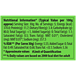 Nutrition per gram/ml: 100g Serving Size: 30g Energy (kcal): 370.0 Protein(g): 11.7 Dietary Fibre(g): 3.4 Carbohydrate (g): 80.0 Total Sugar(g): <1 Added Sugar(g): 0 Total Fat(g): 1.1 Saturated Fat(g): 0.5 Trans Fat(g): NMT 0.01* Cholesterol (mg): NMT 0.01* Sodium (mg): 357.5