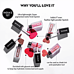 Experience what magic feels like on your lips with India’s 1st ever-SUGAR Air Kiss Powder Lipstick. Yes, you read that right! This unique lipstick with a breakthrough powder formula magically melts into a slick matte finish when applied. It leaves behind a bold burst of colour that stays put for hours without any streaks. Ultra-lightweight and non-drying, it dries off within seconds and settles to a smooth texture that is transfer-proof and water-resistant. If you thought the magic only lies in the texture, think again! The formula of this lightweight powder lipstick is enriched with glycerin and silica, which help keep lips moisturized and supple. 100% vegan and cruelty-free, there's nothing to not love about this unique wonder. Moreover, don’t limit this powder lipstick’s abilities to your lips, go ahead and use it as a cheek tint and eyeshadow, thanks to its soft-blur, blendable formula. Now that’s what we call super-versatile! Take your pick from 5 stunning shades and experience what air feels like on your LIPS with a KISS!