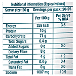 Nutrition_per: 100g Serving_Size: 20g Energy: 358 kcal Protein: 10g Carbohydrate: 71g Total Sugars: 0.4g Added Sugars: 0g Dietary Fibre: 8g Total Fat: 4g Saturated Fat: 0.4g Trans Fat: 0g Sodium: 1087mg