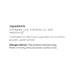 Chickpea, Rice, Rice Bran Oil, Salt, Seasoning*, Maltodextrin, Dextrose, Soya Bean Oil, Turmeric Powder, Yeast Extract