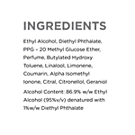 Ethyl Alcohol (95%v/v), Diethyl Phthalate, Perfume, PPG – 20 Methyl Glucose Ether, BHT, Linalool, Limonene, Coumarin, Alpha Isomethyl Ionone, Citronellol, Citral, Geraniol. Alcohol (95%v/v) Content: 86.9% w/w denatured with 1% w/w Diethyl Phthalate.