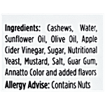 Cashews, water, sunflower oil, olive oil, apple cider vinegar, sugar, nutritional yeast, mustard, salt, guar gum, annatto colour and added flavours