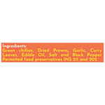 Green Chillies, Dried Prawns, Garlic, Curry Leaves, Edible Oil, Salt, Black Pepper, Permitted Food Preservatives INS211 and 202