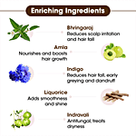 Bhringraj (Eclipta Prostrata Leaf) Extract, Indigo (Indigofera Tinctoria Leaf) Extract, Indravalli (Cardiospermum Halicacabum Leaf) Extract, Amla (Phyllanthus Emblica Fruit) Juice, Sesame (Sesamum Indicum Seed) Oil, Laksha (Lac), Coconut (Cocos Nucifera Fruit) Extract, Licorice (Glycyrrhiza Glabra) Powder, Rosemary (Rosmarinus Officinalis Leaf) Oil, Lavender (Lavandula Hybrida) Oil.