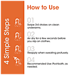 Swipe the roll-on ball for 3-4 strokes on clean underarms. Air dry for a few seconds to dry before you slip on clothes. Pro-tip: Best used post-bathing. Reapply when sweating profusely.