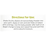 Introducing ShuShu Babies' Gentle and Natural Arrowroot Baby Powder – a talc-free, all-natural solution crafted for your baby's delicate skin. Enriched with pure arrowroot, it keeps your little one dry, fresh, and comfortable all day. Gentle and safe for daily use, it helps prevent rashes while absorbing moisture effectively, making it the perfect everyday companion for your baby.
