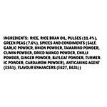 Rice, Rice Bran Oil, Pulses (11.4%), Green Peas (7.6%), Spices And Condiments (Salt, Garlic Powder, Onion Powder, Tamarind Powder, Cumin Powder, Dried Mango Powder, Chilli Powder, Ginger Powder, Bayleaf Powder, Turmeric Powder, Cardamom Powder), Anticaking Agent (E551), Flavour Enhancers (E627, E631)