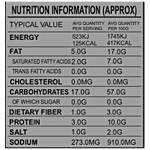 Nutrition per gram/ml: 100g Serving Size: Not Specified Energy: 417KCAL Fat: 17.0G Saturated Fatty Acids: 7.0G Trans Fatty Acids: 0.0G Cholesterol: 0.0MG Carbohydrates: 57.0G Sugar: 0.0G Dietary Fiber: 3.0G Protein: 10.0G Salt: 2.0G Sodium: 910.0MG
