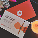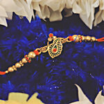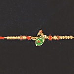 This Rakhi festival, send your loved ones a thread of love. Made with an authentic thread of premium quality. It has a beautiful leaf pendant design as the centrepiece is crafted with artificial diamond gemstones and a string of golden pearl beads on both sides. Handcrafted with love in India.