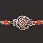 This Rakee festival, send your loved ones a thread of love. Made with an authentic thread of premium quality. It has a beautiful silver pendant design crafted in a circular pattern with Red pearl beads on both ends of the string. Silver represents strength, clarity, purity, and focus. The metal is known for its cooling properties and is a metaphor for the moon. And these qualities are why silver has holy and religious importance. Handcrafted with love in India.
