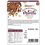 Rolled Oats (18%), Extruded Jowar Flakes (10%) (Jowar, Corn Grits, Iodised Salt, Stabiliser (INS170)), Extruded Foxtail Millet Flakes (10%) (Foxtail Millet, Corn Grits, Iodised Salt, Rice, Stabiliser (INS 170)). Brown Rice Flakes (11%), Cranberries (4%), Black Raisin, Almonds (5%), Pumpkin Seeds, Chia Seeds, Flax Seeds, Cocoa Butter (9%), Cocoa Powder (6%), Jaggery Syrup, Pink Salt, Milk Choco Chips (4%) (Sugar, Edible Vegetable Fat (Palm Oil), Milk Solids, Cocoa Solids, Antioxidant Emulsifier (INS 322), Nature Identical Flavouring Substances (Vanilla, Ethyl Vanillin), Black Dates & Rosemary Extract.