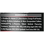 L-Citrulline Dl-Malate (2:1), Beta-Alanine, Orange Fruit Powder, Caffeine {Caffeine Anhydrous & Micro Encapsulated Caffeine (Nescafe)}, L-Theanine, Nature Identical Flavouring Substance, Sweetener (Ins 955), Anticaking Agent (Ins 552), Acidity Regulator (Ins 330) & Synthetic Food Colour (Ins 124).