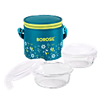 No Question askedBorosil Grace Round Transparent Glass Tiffin Box With Vertical Green Bag