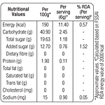 Nutrition per gram/ml: 100g Serving Size: 6g Energy (kcal): 190 Carbohydrate (g): 40.90 Total sugar (g): 19.63 Added sugar (g): 12.70 Protein (g): 1.90 Sodium (mg): 15