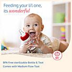 LuvLap Natura Flow Feeding Bottles are ergonomically designed to be easily held while feeding the baby. All LuvLap bottles are 100% BPA free and fully sterilizable. The teats are 100% Liquid Silicone and have an anti-colic valve that vents air into the bottle, preventing any air from entering the baby’s tummy. The teat has grooves at the tip, which encourage peristaltic suckling, while the wide base helps the baby get a natural latch, similar to that on the mother’s breast. This helps ease the transition between breastfeeding & bottle feeding. The grooved teats and superior silicone quality ensure no nipple collapse, helping in an uninterrupted feed.