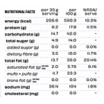 Nutrition_per: 35g Serving_Size: 35g energy (kcal): 206.6 kcal protein (g): 6.2 g carbohydrate (g): 14.7 g total sugar (g): 4.9 g added sugar (g): 0.0 g dietary fibre (g): 3.5 g total fat (g): 13.7 g saturated fat (g): 2.0 g mufa + pufa (g): 11.7 g trans fat (g): 0.0 g sodium (mg): 36.4 mg cholesterol (mg): 0.0 mg
