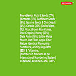 Nuts & Seeds (27%) (Almonds (11%), Sunflower Seeds (6%), Sesame Seeds & Chia Seeds (4%)), Cereals (25%) (Rolled Oats, Oats Flour, Brown Rice Flakes, Rice Crispies), Honey (23%), Date Paste (16%), Edible Maize Starch, Oat Fiber, Apple Fiber, Nature Identical Flavouring Substance, Acidity Regulator (330) & *Vitamins. (Numbers In Brackets As Per International Numbering System) CONTAINS ALMONDS AND OATS.