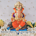 Crafted by skilled artisans from the historic town of Pen in Maharashtra, this exquisitely designed Ganpati Murti is a true masterpiece known for its exceptional craftsmanship, having a legacy of over a century. Our product is available in a vibrant multicolour and is made from eco-friendly and sustainable clay, ensuring that our idols dissolve in water, making them an environmentally conscious choice. This beautiful idol is perfect for celebrating the auspicious occasion of Ganesh Chaturthi and needs to be delicately handled.