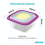 All Time Plastic Prism Square Storage Container Set - Assorted Colour, 5 pcs (300 ml, 600 ml, 1 L, 1.7 L, 3 L)