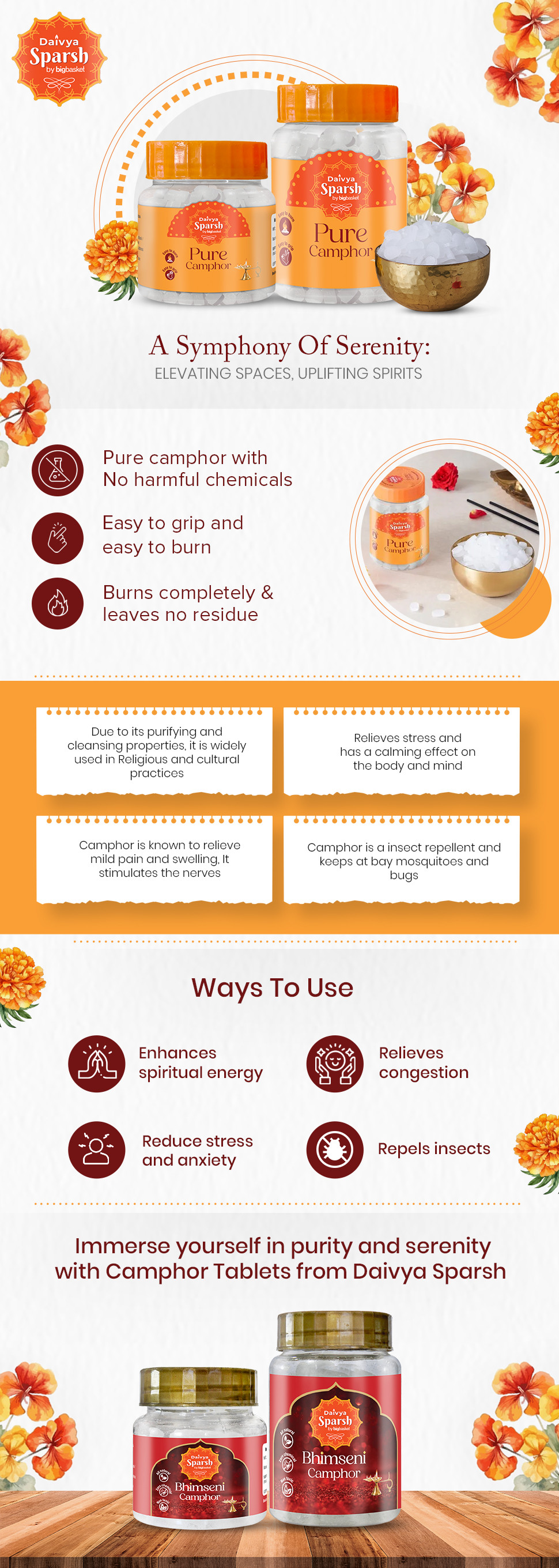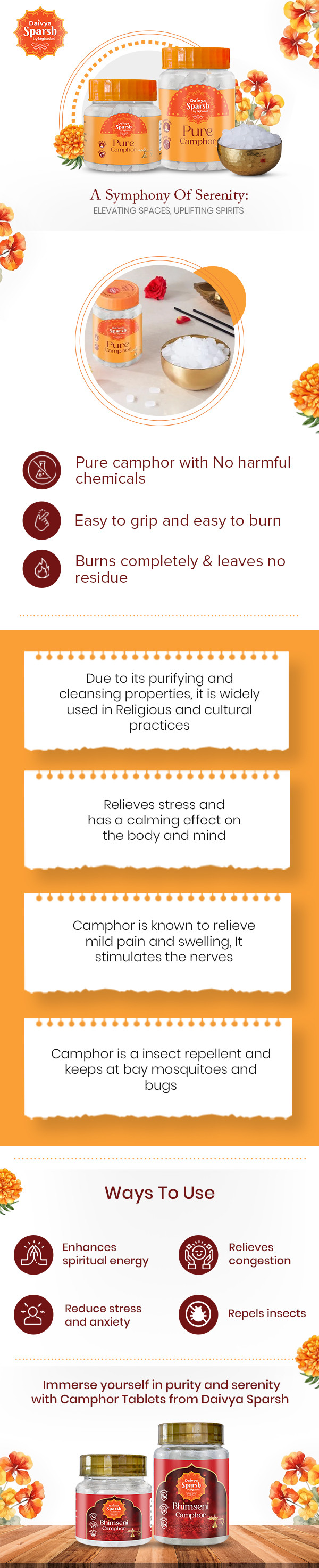 Pure camphor is a versatile substance with a rich history and diverse applications. Its distinct aroma, medicinal properties, and cultural significance have made it a valuable ingredient in various fields, from traditional medicine to spiritual rituals and beyond. When used responsibly and with proper guidance, camphor can provide a multitude of benefits for both the body and the mind. It is free from harmful chemicals, pesticides & no additives. Camphor's association with purity and divinity has made it an integral part of many spiritual and religious customs.