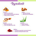 Turmeric Extract Curcuma longa (Rh.) 0.75%, Saffron Extrat Crocus sativus (St.) 0.75%, Aloevera Extract Aloe barbadensis (Lf.) 0.50%, Grapeseed Extract Vitis vinifera (Sd.) 0.75%, Til Oil Sesamum indicum (Sd.) 0.75%, Coconut Oil Cocos nucifera (Ft. End.) 1%, Olive Oil Olea Europoea (Sd) 0.50%, Honey Madhu (Am.) 0.50%