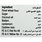 Fine Wheat Flour, Sugar, Coconut Oil, Badam (Almonds), Cardamom, Cashew Nuts, FD & C Red No. 40, FD & C Yellow