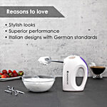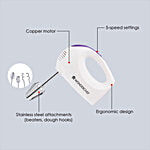 Mix, knead, whip, mash, and blend various ingredients using a 5-speed Acura Plus Hand Mixer Make cakes, pancakes, mashed potatoes, fluffy dough, blend soups – your imagination is the limit! Stainless Steel beater hooks are ideal for mixing heavy ingredients Stainless Steel kneading hooks are ideal for kneading cookie or cake batter Ergonomically designed handle for better grip Easily removable attachments with a single press of the release button Copper motor for longer life Reliable Wonderchef Warranty. T C apply