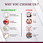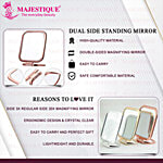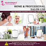 Majestique Table Top Dual Side Makeup Mirror is a versatile and essential tool for your beauty regimen. This mirror offers the convenience of dual sides, with 1X and 20X magnification options. The 1X side provides a regular view for everyday tasks, while the 20X side allows for precise detailing during shaving, makeup application, tweezing, eyebrow shaping, or contact lens insertion. With its square shape, the magnifying mirror offers enhanced clarity, ensuring accurate results. The mirror is designed with 4-layer protective glass, providing excellent scratch resistance and ensuring durability. You can rely on its long-lasting performance and a clear reflection every time. Measuring 17 cm in length, this tabletop mirror strikes the perfect balance between portability and functionality. It comes with a 180-degree stand, allowing you to adjust the angle as per your convenience and needs. Whether you prefer a horizontal or vertical orientation, this mirror provides flexibility to accommodate your preferences. The mirror features a hole for easy hanging, enabling convenient storage when not in use. It comes packed in a corrugation box, ensuring safe transportation and protection from damage during delivery.